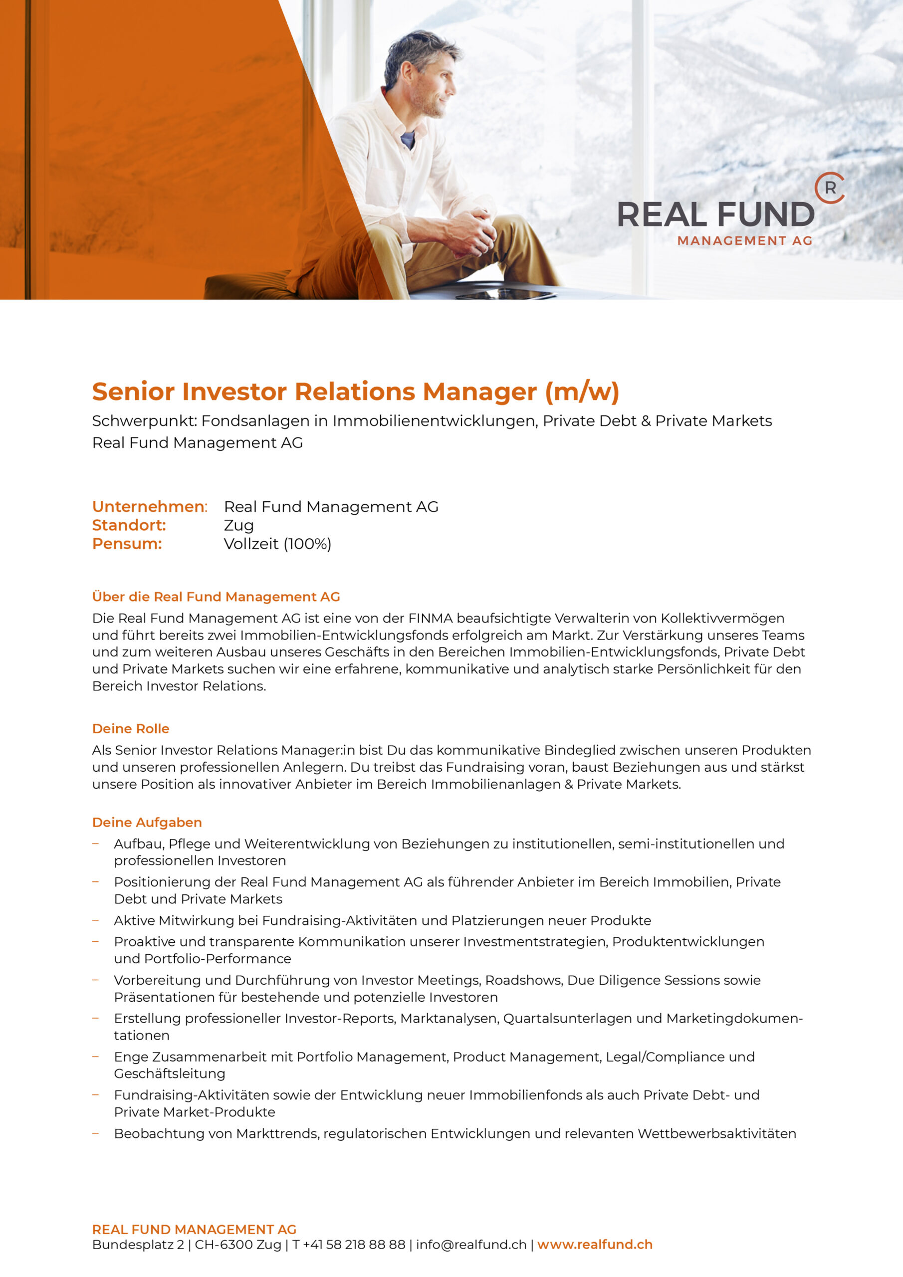 Informationen, die nicht im Verkaufsprospekt mit integriertem Gesellschaftsvertrag oder in den auf der Website erwähnten und der Öffentlichkeit zugänglichen Dokumenten enthalten sind, gelten als nicht autorisiert und sind nicht verlässlich. Die für einen Investitionsentscheid allein massgeblichen Unterlagen können bei der Real Fund Management AG bezogen werden.